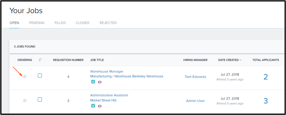 To reorder an Open job, click and hold the icon. , move the job up or down your list of open jobs, after finding the desired location, release your mouse to drop the job.