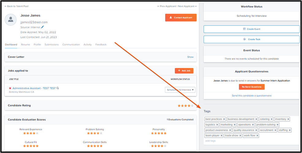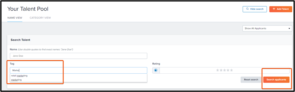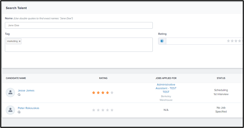 Once the tags are created, you will be able to search this specific applicant in the future. You will be able to type in the specific tag within the Tags field and choose the tag from the dropdown window.