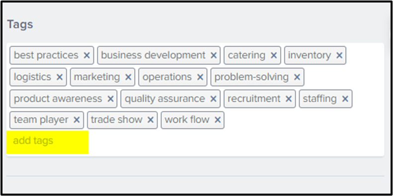 To create tags, click within the add tags field. Enter your first tag and click Enter/Return on your keyboard. If you have other tags to enter, please add a space between the tags and type in the second tag and click Enter/Return.