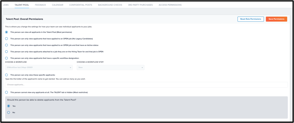 Choose the appropriate tab (Job, Talent Pool, Feedback, etc.) you wish to add, edit, or remove one's permission.