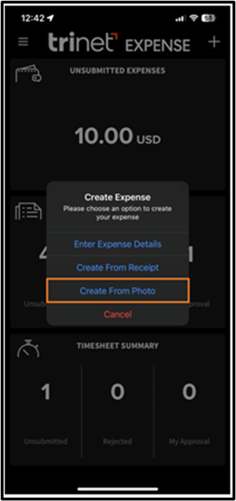 4. Take a picture of the receipt and tap Create Expense
