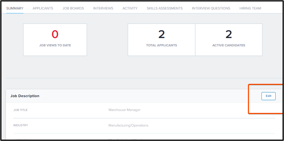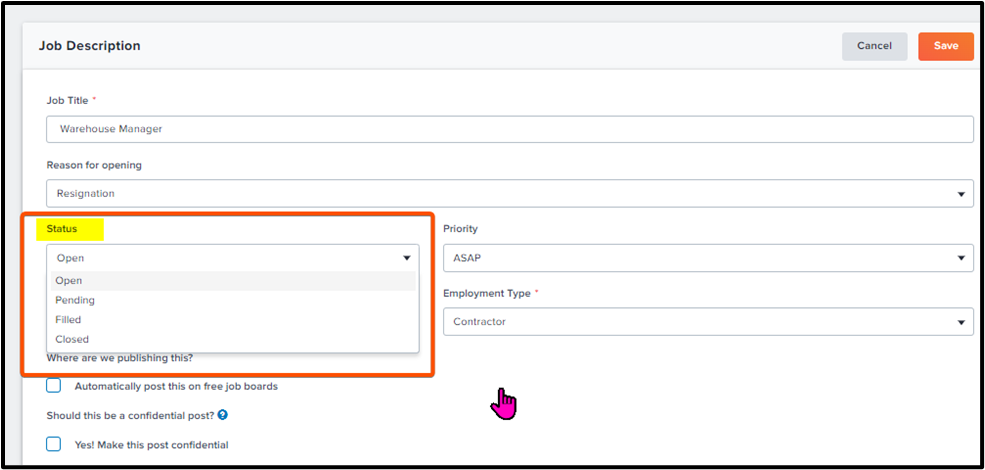 Scroll down to the Job Description section and select the new job status from the drop-down.