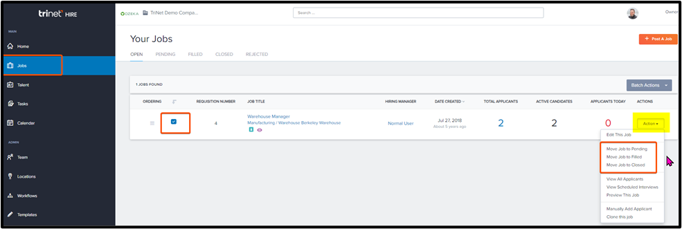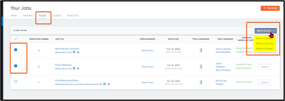You can also change a Job's status by clicking on the Jobs tab>click into the status group intended (open, pending, filled, closed, rejected) >Check the box to the left of the Job requisition number>click on the Actions dropdown on the right-hand side> and click Move to 'status'.