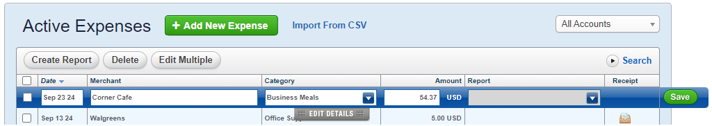 When creating a new expense item, you will need to click on the grey Edit Details box to navigate to the additional fields that allow details such as designating an expense item as Billable instead of the default non-billable. You can click into any of the default fields to get the Edit Details box to display.