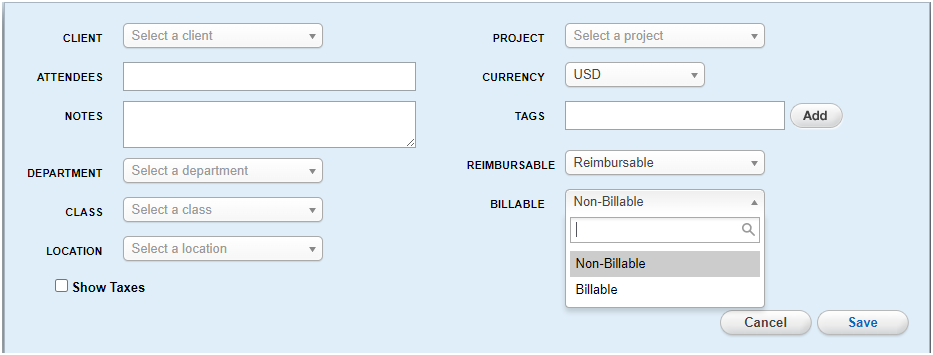 Click on the drop-down next to the field titled BILLABLE and select Billable from the list.