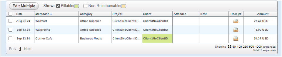 If expense items have been designated as Billable, an approver or Expense Admin will be able to view these by clicking the checkbox next to Show: Billable